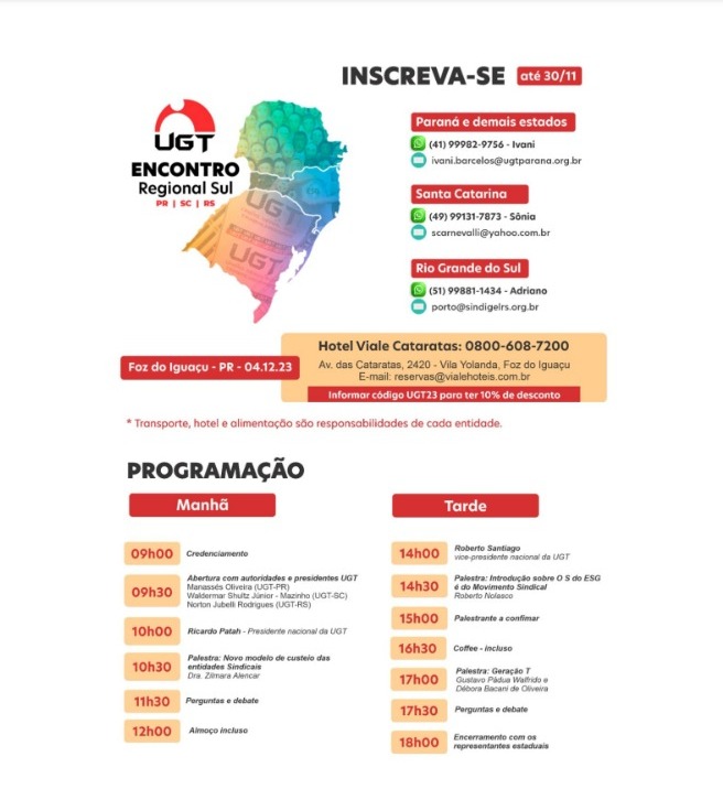 Sindicato do Empregados em Estabelecimentos de serviços de Saúde de Joinville e Região, participando do encontro Regional Sul da UGT (PR, SC e RS) com a participação do Presidente Senhor Lorival Pisetta e demais dirigentes da Entidade Sindical, Almir Alexandre, Delcio Pereira, Wilson Vieira Przywitowski, Doraci Rodrigues dos Santos Varella e Alzira Martins, sobre temas de interesse da Classe Trabalhadora.