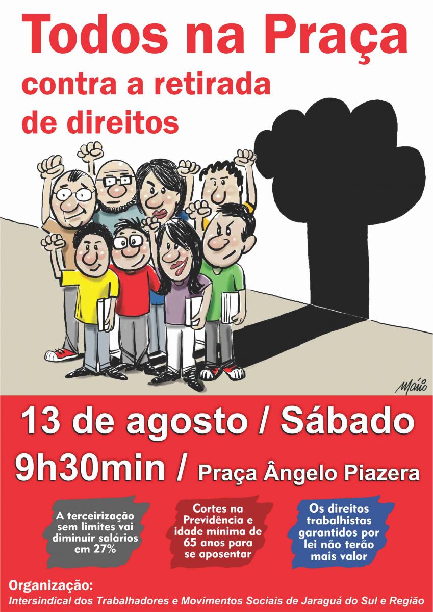 A direção do Sindicato da Saúde vai participar do Ato Público realizado pela Intersindical dos Trabalhadores de Jaraguá do Sul e Região e os movimentos sociais na manhã deste sábado, dia 13, a partir das 9h30, na Praça Ângelo Piazera, para alertar a população das tentativas de retiradas de direitos dos trabalhadores pelo presidente interino. Para o diretor do Sindicato na Subsede de Jaraguá do Sul Almir Alexandre os trabalhadores precisam ficar atentos para que não aconteça um retrocesso nos direitos trabalhistas. “É preocupante a situação que está sendo projetada pelo atual governo”, comenta.