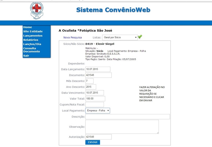 Depois de ter clicado em LOCALIZAR irá localizar a autorização para validar a mesma. Aonde poderá alterar o valor se necessário ou acrescentar alguma informação no campo observação, e Clicar em ENVIAR
